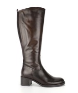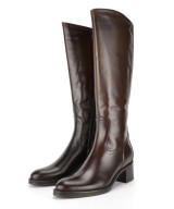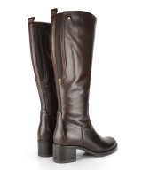 Bota alta de piel extra suave marrón chocolate, cremallera en un lateral y elásticos en la parte trasera de la caña. Suela de goma y tacón ancho de 5cm