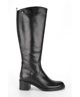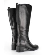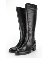 Bota alta de piel extra suave negra, cremallera en un lateral y elásticos en la parte trasera de la caña. Suela de goma y tacón ancho de 5cm