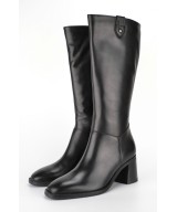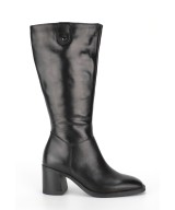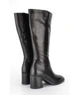 Bota alta de piel suave negra con cremallera lateral, elástico invisible en la parte alta de la caña, suela de goma y tacón ancho de 6,5cm