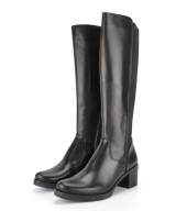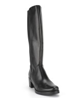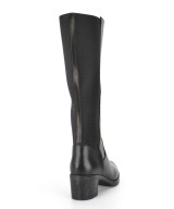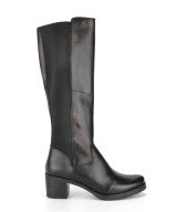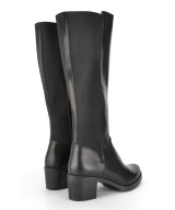Bota alta de piel suave negra con caña de ancho especial, cremallera lateral, elásticos en la parte trasera y suela de goma con tacón ancho de 5,5cm