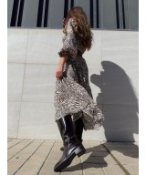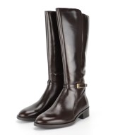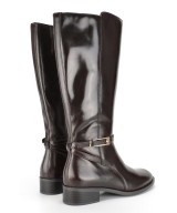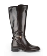 Bota alta de piel marrón chocolate, cremallera lateral, elástico invisible en la parte alta de la caña, tira fina con hebilla en el tobillo y suela de goma con tacón ancho de 3,5cm