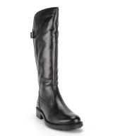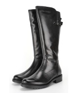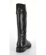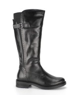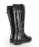 Bota alta de piel suave negra con picados, cremallera lateral, elástico en el lateral y parte alta de la caña. Suela de goma