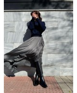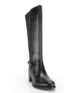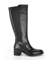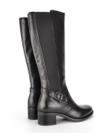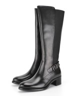 Bota alta de piel suave negra, cremallera lateral y elástico en el otro lateral, adorno de tira con hebilla en el tobillo y suela de goma con tacón ancho de 5cm
