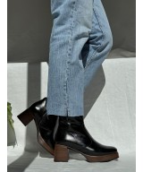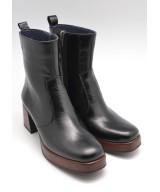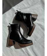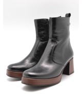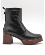 Botín de piel suave negra, cierra con cremallera lateral, punta cuadrada, plataforma efecto madera de 2cm y tacón ancho efecto madera de 7cm