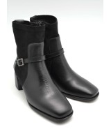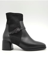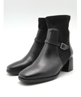 Botín combinado de piel y telido elástico negro con cremallera lateral, adorno de tira con hebilla y suela de goma con tacón ancho grabado de 5,5cm