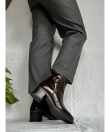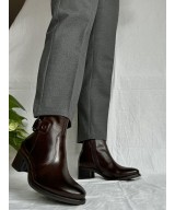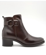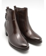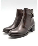 Botín de piel marrón chocolate con cremallera lateral, adorno metálico en la caña y suela de goma con tacón ancho de 4,5cm