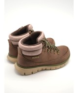 Botín marrón con cordones estilo montañero, forrados de franela, plantilla memory foam y suela de goma ligera antideslizante. 100% repelente al agua