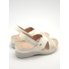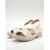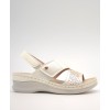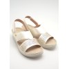 Sandalia hielo brillante con picados, ajuste con dos velcros, plantilla acolchada, suela de goma con cuña de 5cm y plataforma de 2cm