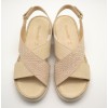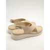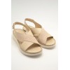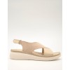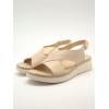 Sandalia ligera de piel extra suave beige con dos tiras anchas cruzadas en la pala, una de ellas con grabado efecto trenzado, ajuste con velcro, plantilla acolchada y suela de goma con cuña de 4,5cm y plataforma de 2cm