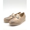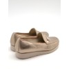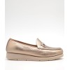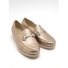 Mocasín dorado de horma anha, adorno metálico en la pala, plantilla acolchada y suela de goma