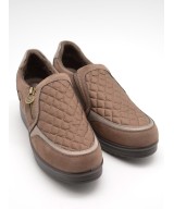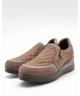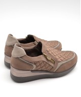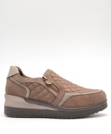 Mocasin taupe guateado y liso con cremallera en un lateral de la pala y elástico en el otro, plantilla acolchada extraíble y suela de goma con cuña de 5cm y plataforma de 2cm