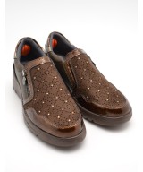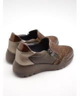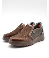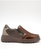 Mocasín marrón chocolate con pedrería, cremallera en un lateral de la pala y elástico en el otro, plantilla acolchada extraíble y suela de goma con cuña de 4,5cm y plataforma de 2cm