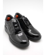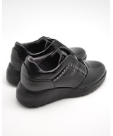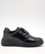 Zapato acharolado negro con cordones elásticos, mini tachuelas en un lateral, plantilla acolchada extraíble y suela de goma extra ligera con cuña de 4,5cm y plataforma de 2cm