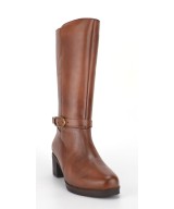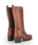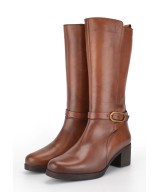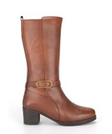 Bota de media caña de piel suave marrón con adorno de tira con hebilla en el tobillo, cremallera lateral, elástico trasero y suela de goma con tacón ancho de 5,5cm