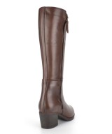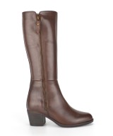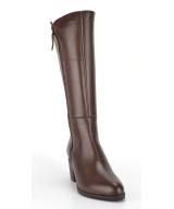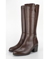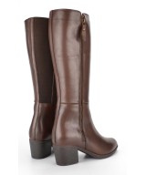 Bota alta de piel suave marrón chocolate con cremallera en ambos laterales, elástico trasero y suela de goma con tacón ancho de 6cm