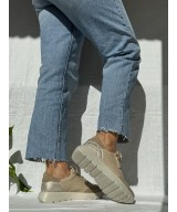 Zapato deportivo tostado con cordones elásticos y cremallera, picados, detalle de serpiente y tachas en el talón, plantilla acolchada extraíble y suela de goma ligera