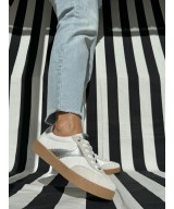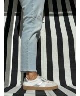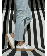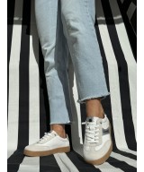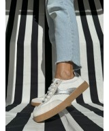 Deportiva de piel blanca con detalles plata, cordones elásticos, plantilla acolchada extraíble y suela de goma color caramelo