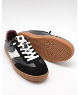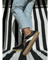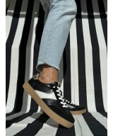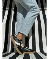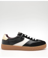 Deportiva de piel negra con detalles blancos y oro, cordones elásticos, plantilla acolchada extraíble y suela de goma color caramelo