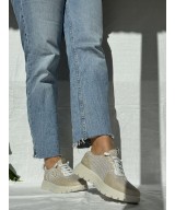 Zapato deportivo beige y dorado con cordones elásticos, plantilla acolchada extraíble y suela de goma ligera