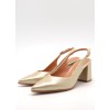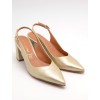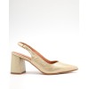 Zapato destalonado dorado con punta fina, escote en V, ajuste con hebilla y tacón ancho forrado de 7,5cm