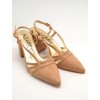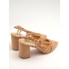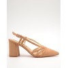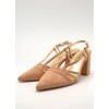 Zapato color tostado con punta fina, tiras finas en la pala y laterales, ajuste con hebilla y tacón ancho forrado de 8cm