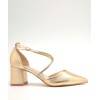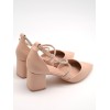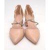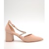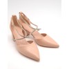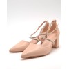 Zapato nude con punta fina, tiras cruzadas en el empeine con pedrería, ajuste con hebilla, talón cerrado y tacón ancho forrado de 6cm
