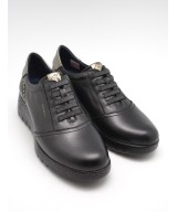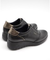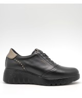 Zapato de piel negra con cordones elásticos, cremallera lateral, plantilla acolchada extraíble, detalles dorados y suela de goma ligera con cuña de 5cm y plataforma de 2cm
